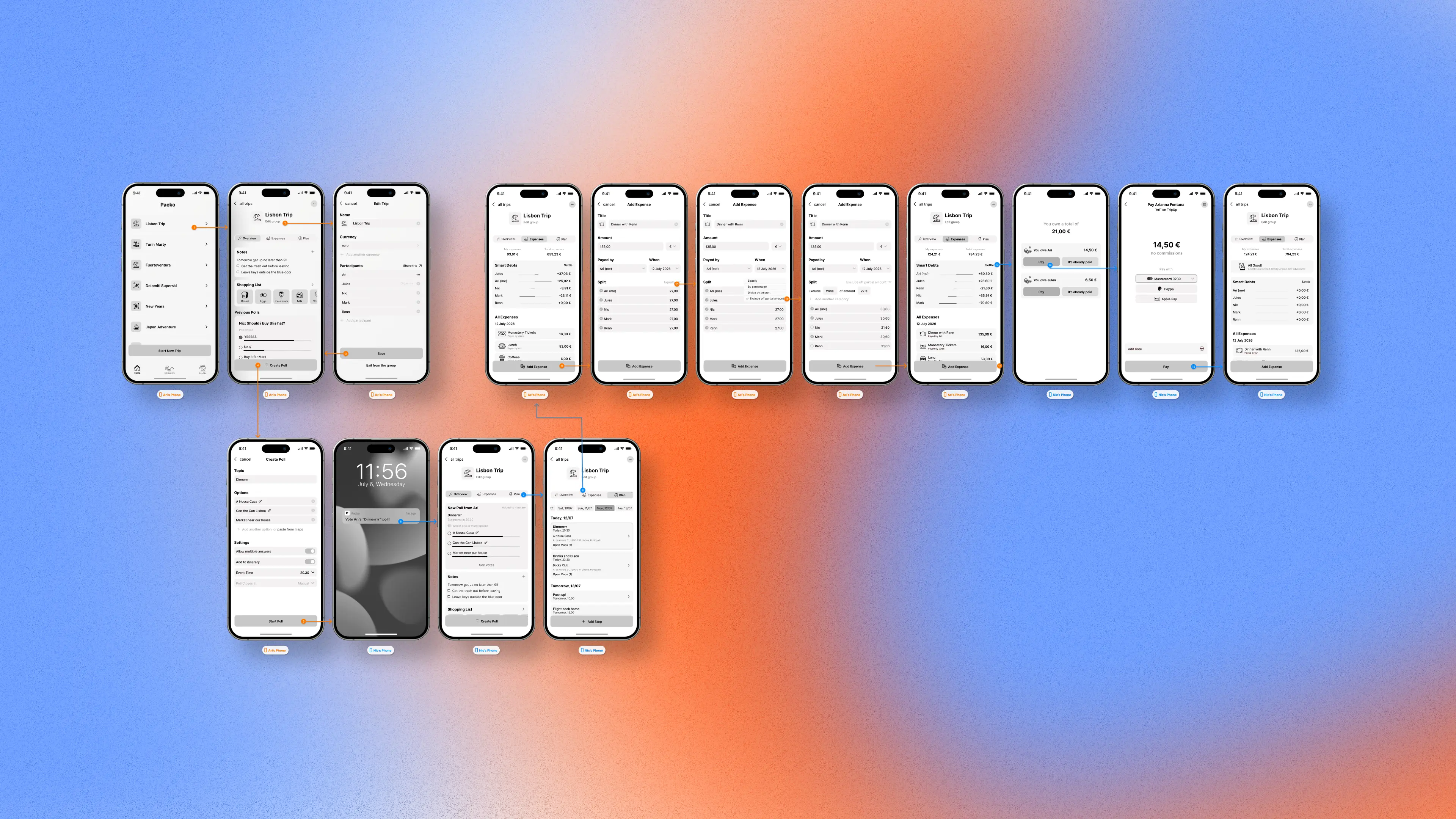 In the wireframe flow, users add a new friend, run a real-time poll to choose where to have dinner, then they split the bill with custom amounts and settle their debts.